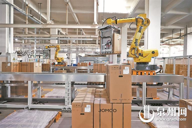 在南安数字化卫浴产业园九牧卫浴生产车间内,机械臂正在吊装产品。(融媒体记者陈晓东 摄)