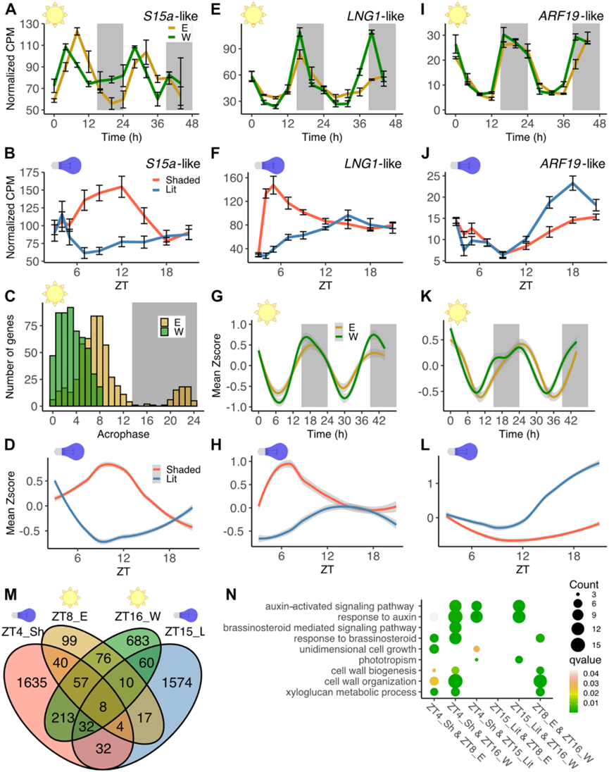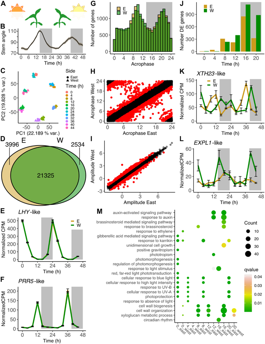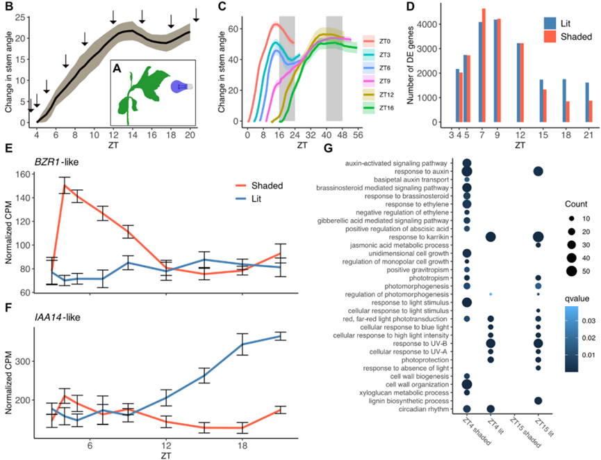 图4 向日性的启动显示出独特的转录特征,且发生在不同的光照条件下