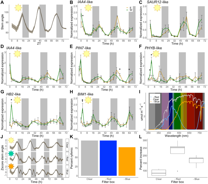 然而,一些在向光性过程中快速诱导的基因,以及与叶面遮荫生长反应有关的基因,在向光性开始时在茎的西侧快速诱导,这表明红光光感受器可能在太阳跟踪中起作用。
