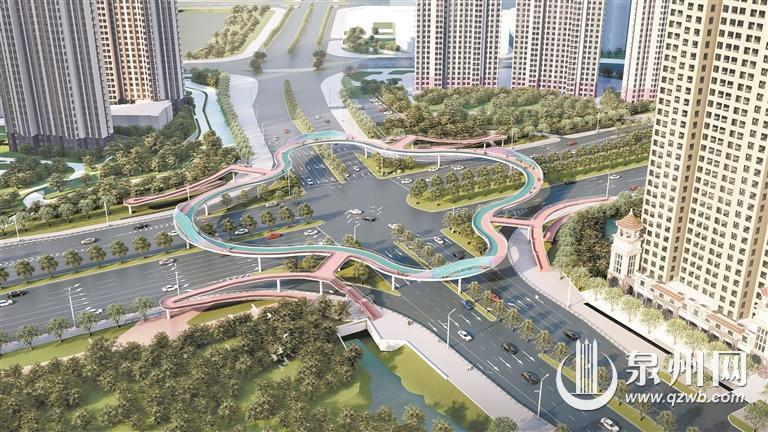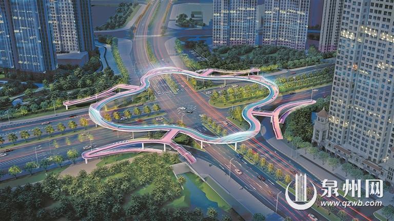 该天桥整体呈四瓣花造型,由主桥、连廊、梯坡道等组成。其中,主桥总长约407.5米,采用十六跨连续钢箱梁结构,梯坡道均落地于交叉口四侧人行道,便于电动车、自行车等轻便交通工具与行人通行;梯坡道与主桥之间设置连廊进行衔接,连廊局部设计花瓣景观构架,构架顶部覆盖耐力板,下方配备休憩座椅,为行人提供休息和等候场所,同时提供一定遮阴避雨功能。