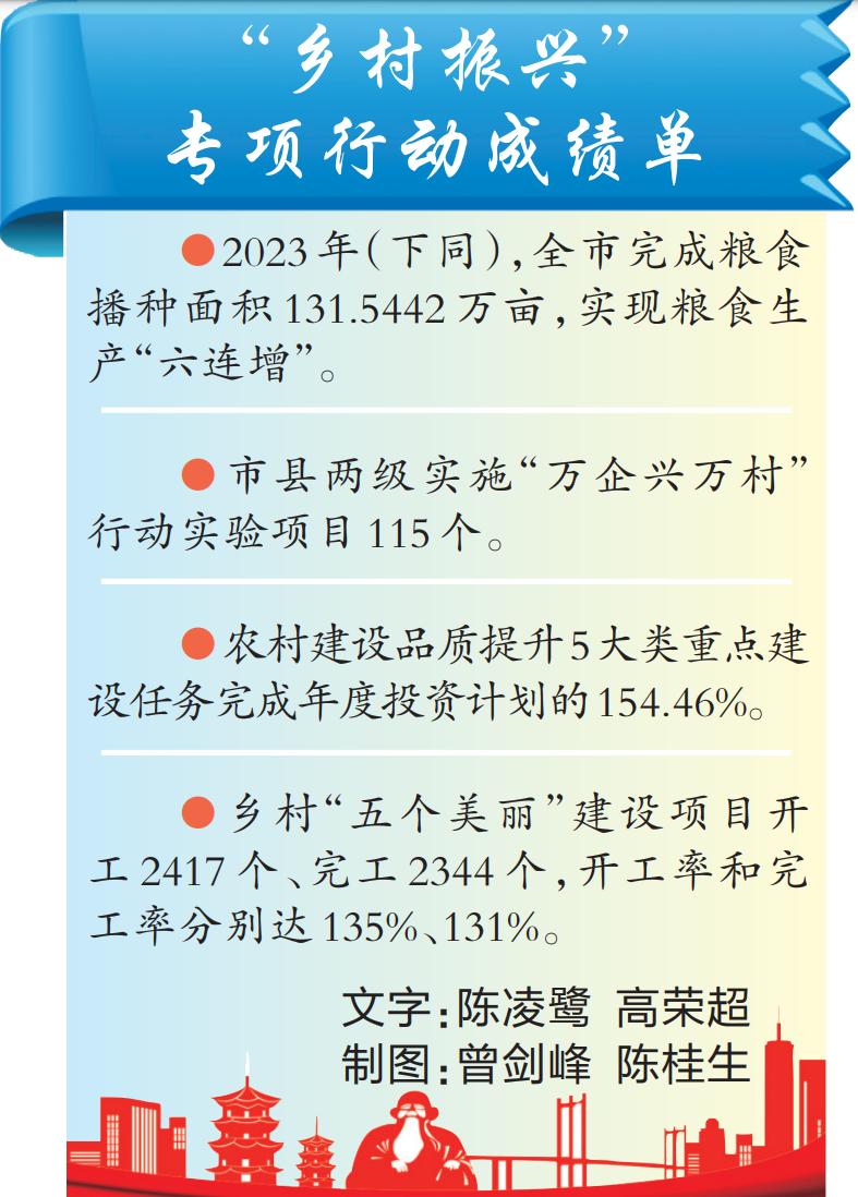 2023年以来,市农业农村局传承弘扬、创新发展“晋江经验”,以“千万工程”经验为引领,以“乡村振兴”专项行动为抓手,聚焦“两底线、三重点”,聚力脱贫成果巩固提升、乡村产业质效提升、乡村建设品质提升、乡村治理效能提升等“四大提升计划”,实施试点村“梯度提档”工程、示范线“增量提质”工程、整镇推进“五好培育”工程等“三大示范工程”,“三农”各项事业稳步向好发展。