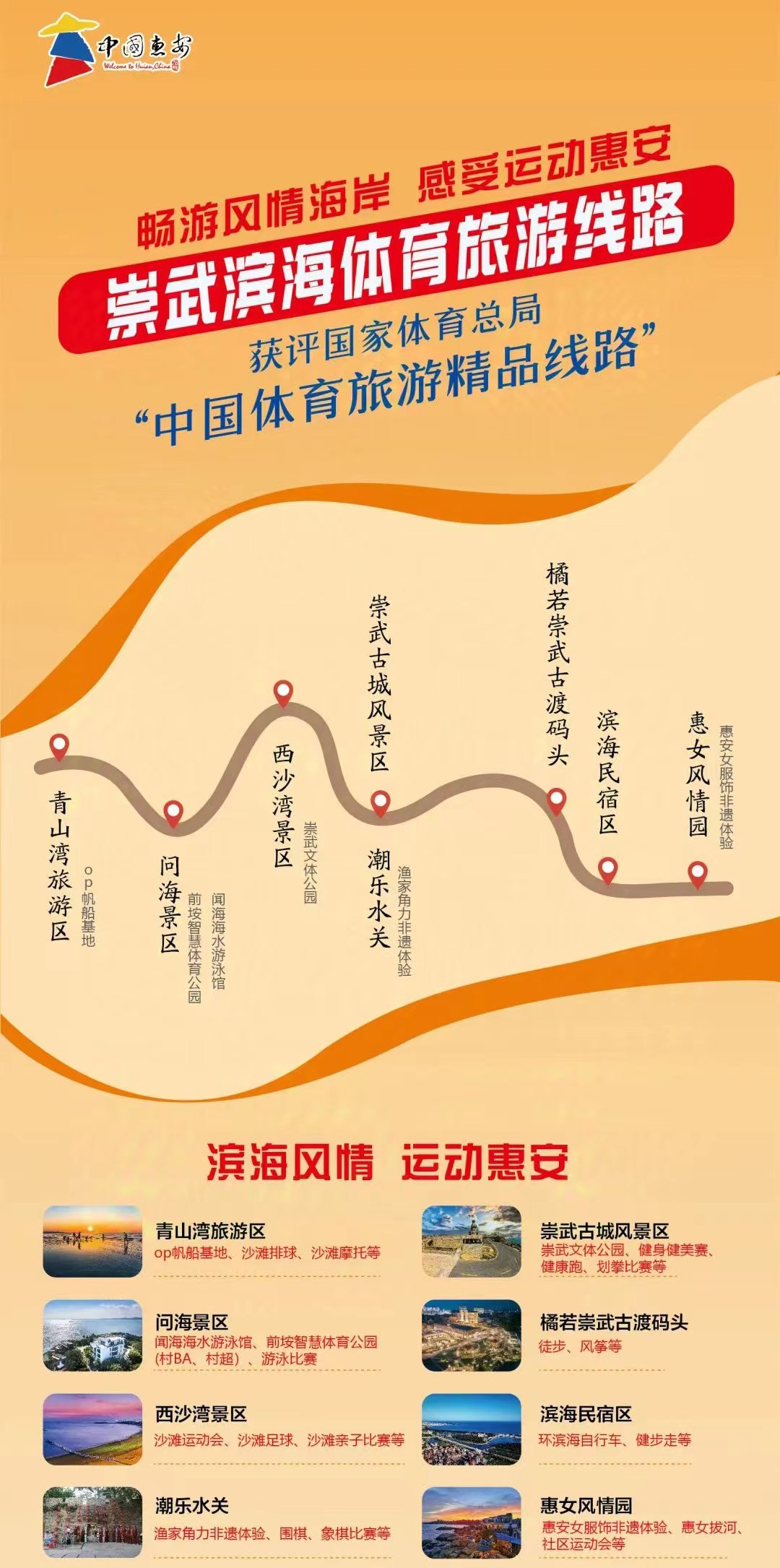 10月10日至13日,2024中国体育文化博览会、中国体育旅游博览会在苏州国际博览中心举办。888集团惠安崇武滨海体育旅游线路成功入选“中国体育旅游精品项目”,被评为“中国体育旅游精品线路”。 该线路总长11公里,通过巧妙融合 “体育+沙滩”“体育+景点”等模式,将沿海丰富的景点资源与完善的体育设施结合,依托独特的惠女文化、深厚的海洋文化以及悠久的屯兵文化,充分借助滨海沿线的迷人风光,串联起青山湾旅游区、崇武古城、惠女风情园等热门景点,精心打造出这条别具一格的精品体育旅游线路,并积极开展丰富多彩的在地体育项目,以独特模式吸引着大量游客前来参与体验。