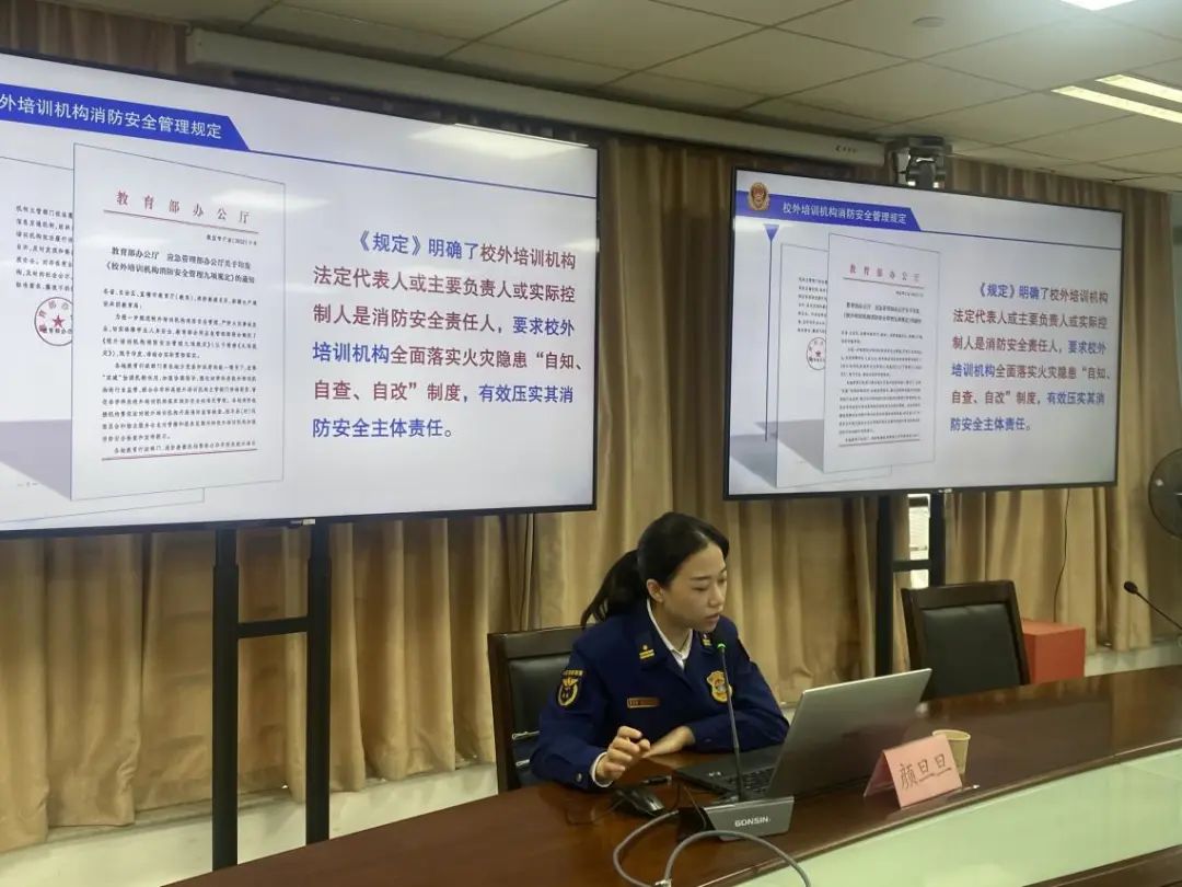 为进一步强化校外培训机构安全监管工作,确保我市校外培训机构安全,不断筑牢安全屏障,11月10日上午,市教育局召开全市校外培训机构安全管理专题会议。会议采用线上线下相结合的方式,由市教育局四级调研员纪如主持,市消防救援支队防火监督科科长颜旦旦就《校外培训机构消防安全管理九项规定》宣贯并对重大消防安全风险隐患排查整治专项行动进行培训。