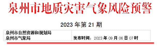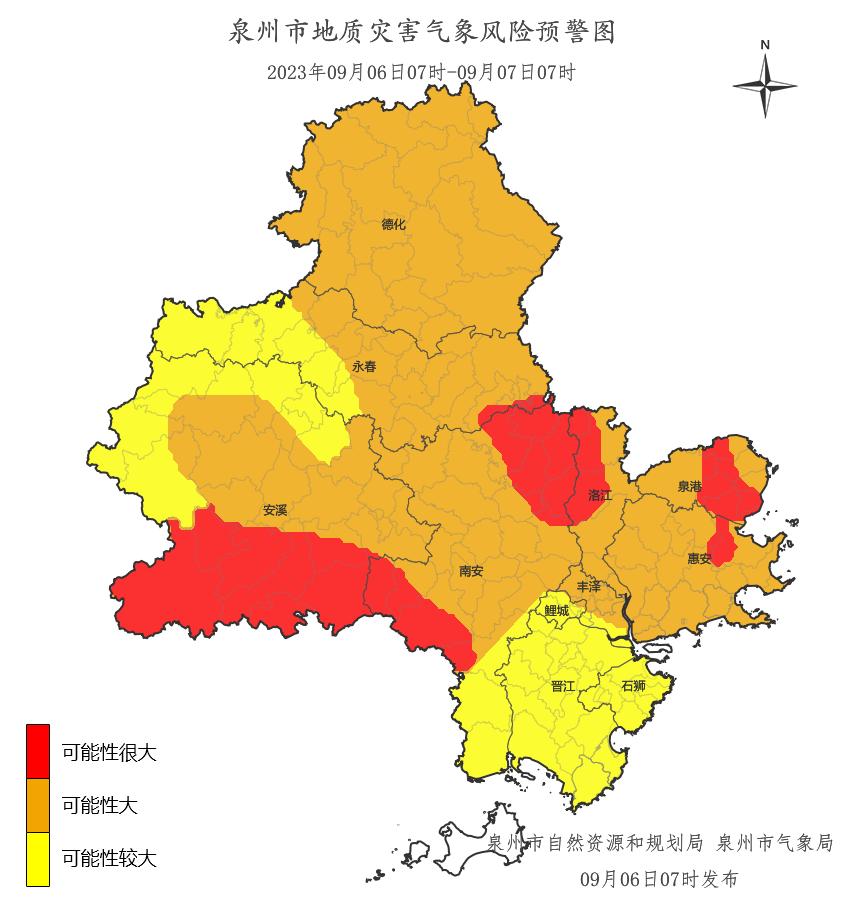 预计,09月06日07时至09月07日07时,洛江区罗溪镇、马甲镇、虹山乡,泉港区山腰街道、南埔镇、界山镇、后龙镇、峰尾镇、前黄镇、涂岭镇,惠安县涂寨镇、东桥镇、辋川镇,安溪县官桥镇、城厢镇、龙门镇、虎邱镇、芦田镇、西坪镇、尚卿乡、大坪乡、龙涓乡,永春县湖洋镇、东关镇、外山乡,南安市东田镇、英都镇、翔云镇、九都镇、乐峰镇、罗东镇、梅山镇、洪濑镇、洪梅镇、向阳乡,地质灾害气象风险等级为红色预警,地质灾害发生可能性很大,各地要在县政府的领导下,结合本地区雨情预报情况,提前转移隐患点、房前屋后高陡边坡、山边河边等地质灾害危险区内受威胁群众。