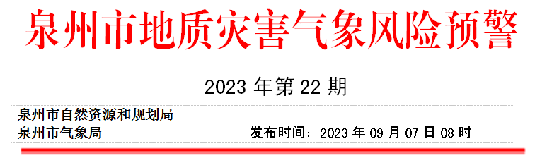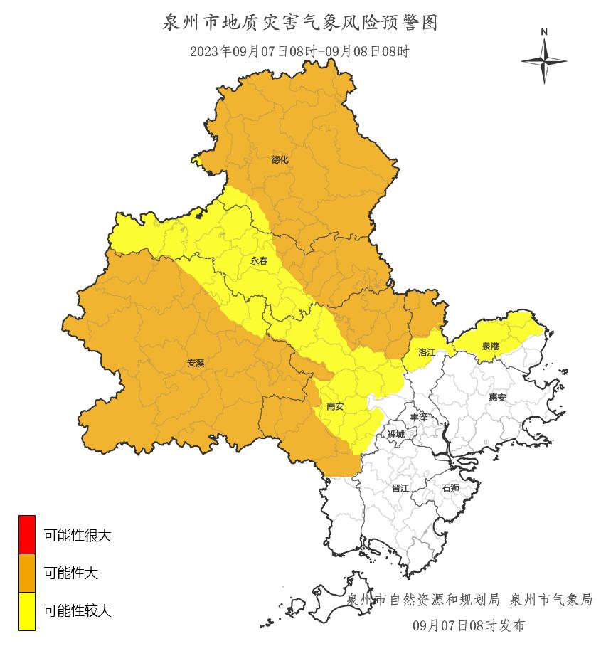 预计,09月07日08时至09月08日08时,洛江区罗溪镇、虹山乡,安溪县凤城镇、蓬莱镇、湖头镇、官桥镇、剑斗镇、城厢镇、金谷镇、龙门镇、虎邱镇、芦田镇、感德镇、魁斗镇、西坪镇、参内镇、白濑乡、湖上乡、尚卿乡、大坪乡、龙涓乡、长卿镇、蓝田乡、祥华乡、桃舟乡、福田乡,永春县桃城镇、五里街道、一都镇、蓬壶镇、吾峰镇、石鼓镇、东平镇、湖洋镇、东关镇、苏坑镇、介福乡、外山乡,德化县浔中镇、龙浔镇、三班镇、龙门滩镇、雷峰镇、南埕镇、水口镇、赤水镇、上涌镇、葛坑镇、盖德镇、美湖镇、杨梅乡、汤头乡、桂阳乡、国宝乡、大铭乡、春美乡,南安市溪美街道、柳城街道、仑苍镇、东田镇、英都镇、翔云镇、码头镇、九都镇、乐峰镇、罗东镇、洪濑镇、洪梅镇、眉山乡、向阳乡,地质灾害气象风险等级为橙色预警,地质灾害发生可能性大,应做好值班值守、监测、巡查和防范,应按有关规定及时组织危险性较大的地灾隐患点和危险区域内的群众转移,确保人民生命安全。