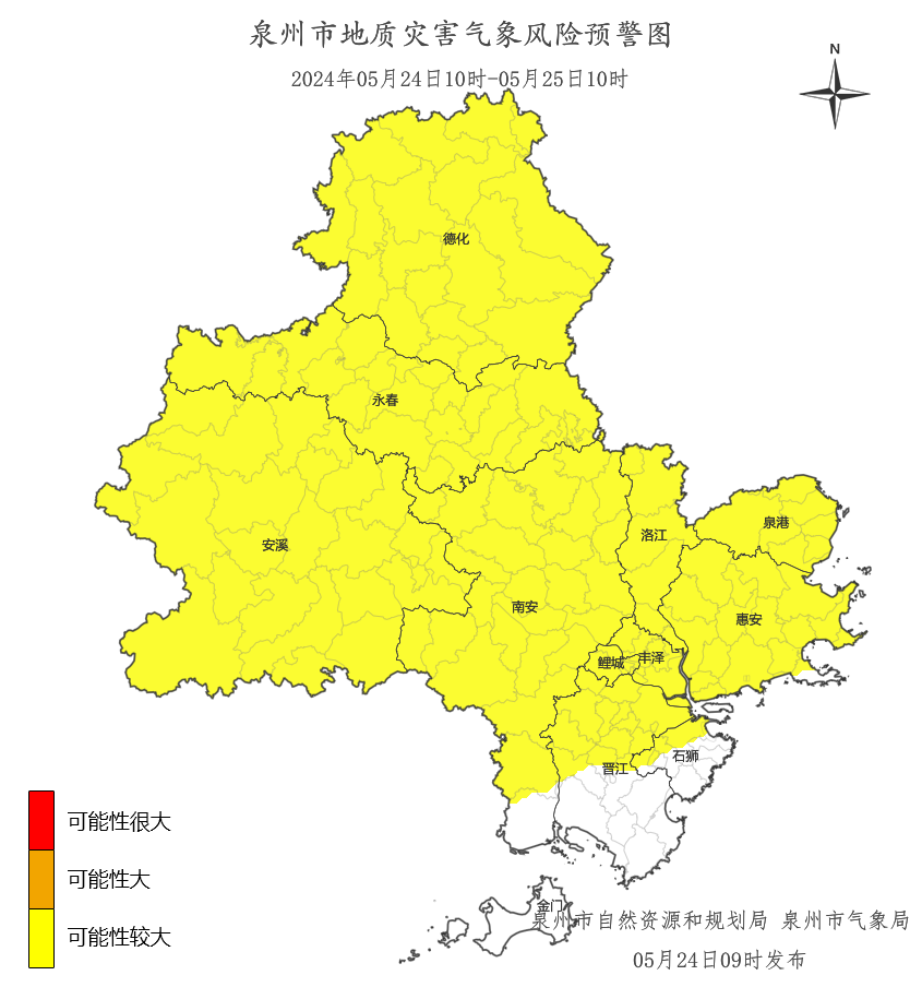 预计,05月24日10时至05月25日10时,鲤城区海滨街道、鲤中街道、开元街道、浮桥街道、金龙街道,丰泽区东湖街道、丰泽街道、泉秀街道、清源街道、华大街道、城东街道、东海街道、北峰街道,洛江区万安街道、双阳街道、罗溪镇、马甲镇、河市镇、虹山乡,泉港区山腰街道、南埔镇、界山镇、后龙镇、峰尾镇、前黄镇、涂岭镇,惠安县螺城镇、螺阳镇、黄塘镇、紫山镇、洛阳镇、东园镇、张坂镇、崇武镇、山霞镇、涂寨镇、东岭镇、东桥镇、净峰镇、小岞镇、辋川镇、百崎回族乡,安溪县凤城镇、蓬莱镇、湖头镇、官桥镇、剑斗镇、城厢镇、金谷镇、龙门镇、虎邱镇、芦田镇、感德镇、魁斗镇、西坪镇、参内镇、白濑乡、湖上乡、尚卿乡、大坪乡、龙涓乡、长卿镇、蓝田乡、祥华乡、桃舟乡、福田乡,永春县桃城镇、五里街道、一都镇、下洋镇、蓬壶镇、达埔镇、吾峰镇、石鼓镇、岵山镇、东平镇、湖洋镇、坑仔口镇、玉斗镇、锦斗镇、东关镇、桂洋镇、苏坑镇、仙夹镇、横口乡、呈祥镇、介福乡、外山乡,德化县浔中镇、龙浔镇、三班镇、龙门滩镇、雷峰镇、南埕镇、水口镇、赤水镇、上涌镇、葛坑镇、盖德镇、美湖镇、杨梅乡、汤头乡、桂阳乡、国宝乡、大铭乡、春美乡,石狮市湖滨街道、凤里街道、灵秀镇、宝盖镇、蚶江镇、祥芝镇,晋江市青阳街道、梅岭街道、西园街道、罗山街道、灵源街道、新塘街道、陈埭镇、池店镇、安海镇、磁灶镇、内坑镇、紫帽镇、东石镇、永和镇、西滨镇,南安市溪美街道、柳城街道、美林街道、省新镇、仑苍镇、东田镇、英都镇、翔云镇、金淘镇、诗山镇、蓬华镇、码头镇、九都镇、乐峰镇、罗东镇、梅山镇、洪濑镇、洪梅镇、康美镇、丰州镇、霞美镇、水头镇、石井镇、眉山乡、向阳乡,地质灾害气象风险等级为黄色预警,地质灾害发生可能性较大,应加强对地质灾害隐患点的监测和对高陡边坡、易发泥石流的沟口等易发区的巡查和防范,如果发现地灾险情应及时采取防灾避险措施,确保人民生命安全。