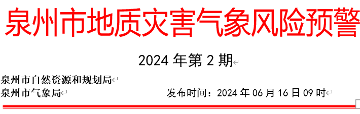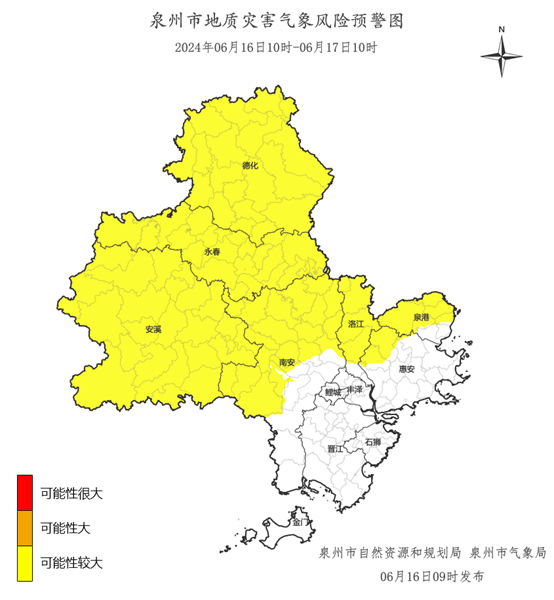 预计,06月16日10时至06月17日10时,洛江区双阳街道、罗溪镇、马甲镇、河市镇、虹山乡,泉港区山腰街道、南埔镇、界山镇、后龙镇、峰尾镇、前黄镇、涂岭镇,惠安县螺城镇、黄塘镇、紫山镇、洛阳镇、辋川镇,安溪县凤城镇、蓬莱镇、湖头镇、官桥镇、剑斗镇、城厢镇、金谷镇、龙门镇、虎邱镇、芦田镇、感德镇、魁斗镇、西坪镇、参内镇、白濑乡、湖上乡、尚卿乡、大坪乡、龙涓乡、长卿镇、蓝田乡、祥华乡、桃舟乡、福田乡,永春县桃城镇、五里街道、一都镇、下洋镇、蓬壶镇、达埔镇、吾峰镇、石鼓镇、岵山镇、东平镇、湖洋镇、坑仔口镇、玉斗镇、锦斗镇、东关镇、桂洋镇、苏坑镇、仙夹镇、横口乡、呈祥镇、介福乡、外山乡,德化县浔中镇、龙浔镇、三班镇、龙门滩镇、雷峰镇、南埕镇、水口镇、赤水镇、上涌镇、葛坑镇、盖德镇、美湖镇、杨梅乡、汤头乡、桂阳乡、国宝乡、大铭乡、春美乡,南安市溪美街道、柳城街道、美林街道、省新镇、仑苍镇、东田镇、英都镇、翔云镇、金淘镇、诗山镇、蓬华镇、码头镇、九都镇、乐峰镇、罗东镇、梅山镇、洪濑镇、洪梅镇、康美镇、眉山乡、向阳乡,地质灾害气象风险等级为黄色预警,地质灾害发生可能性较大,应加强对地质灾害隐患点的监测和对高陡边坡、易发泥石流的沟口等易发区的巡查和防范,如果发现地灾险情应及时采取防灾避险措施,确保人民生命安全。
