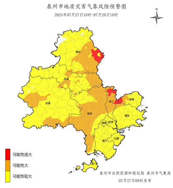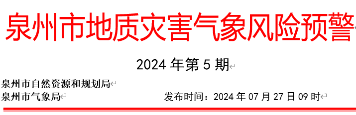 预计,07月27日10时至07月28日10时,洛江区罗溪镇、马甲镇、河市镇、虹山乡,泉港区涂岭镇,惠安县紫山镇,德化县龙门滩镇、雷峰镇、南埕镇、水口镇,地质灾害气象风险等级为红色预警,地质灾害发生可能性很大,各地要在县政府的领导下,结合本地区雨情预报情况,提前转移隐患点、房前屋后高陡边坡、山边河边等地质灾害危险区内受威胁群众。