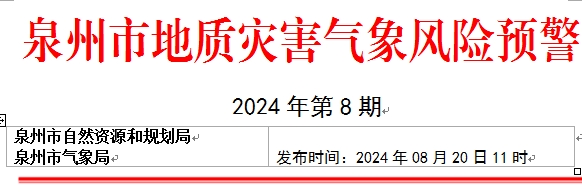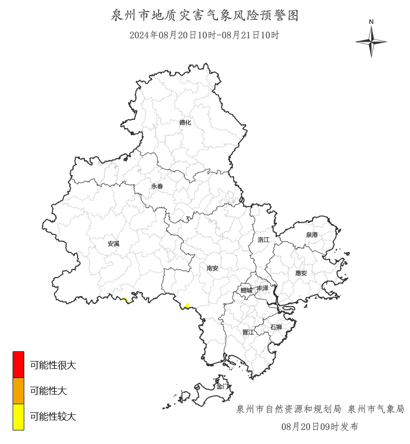 预计,08月20日10时至08月21日10时,安溪县大坪乡,南安市东田镇,地质灾害气象风险等级为黄色预警,地质灾害发生可能性较大,应加强对地质灾害隐患点的监测和对高陡边坡、易发泥石流的沟口等易发区的巡查和防范,如果发现地灾险情应及时采取防灾避险措施,确保人民生命安全。