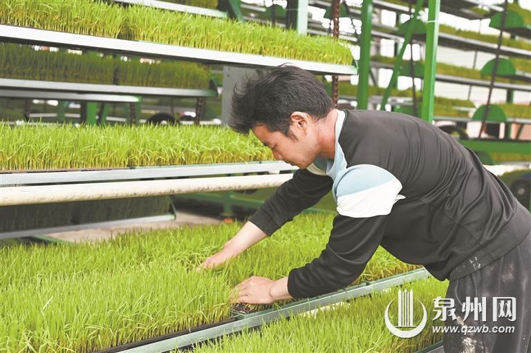 在育秧棚里,记者看到三台智能化育秧设备高效运转,上面一盘盘秧苗仿佛“坐电梯”般上下移动,在一圈圈循环中完成喷淋、光照等工序,长势喜人。这是福建省机械科学研究院联合坤德农场自主研发的全省首台智能控制立体循环种植床。